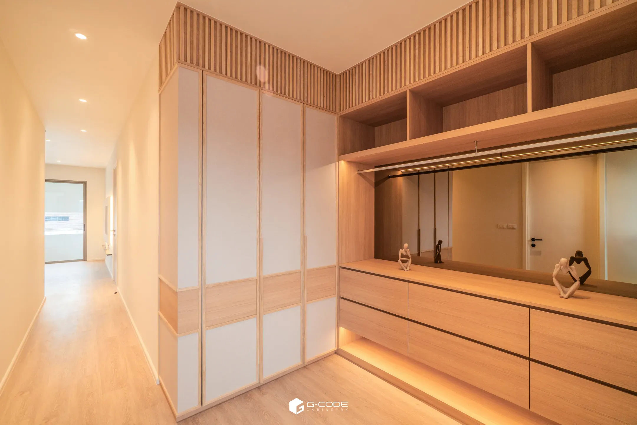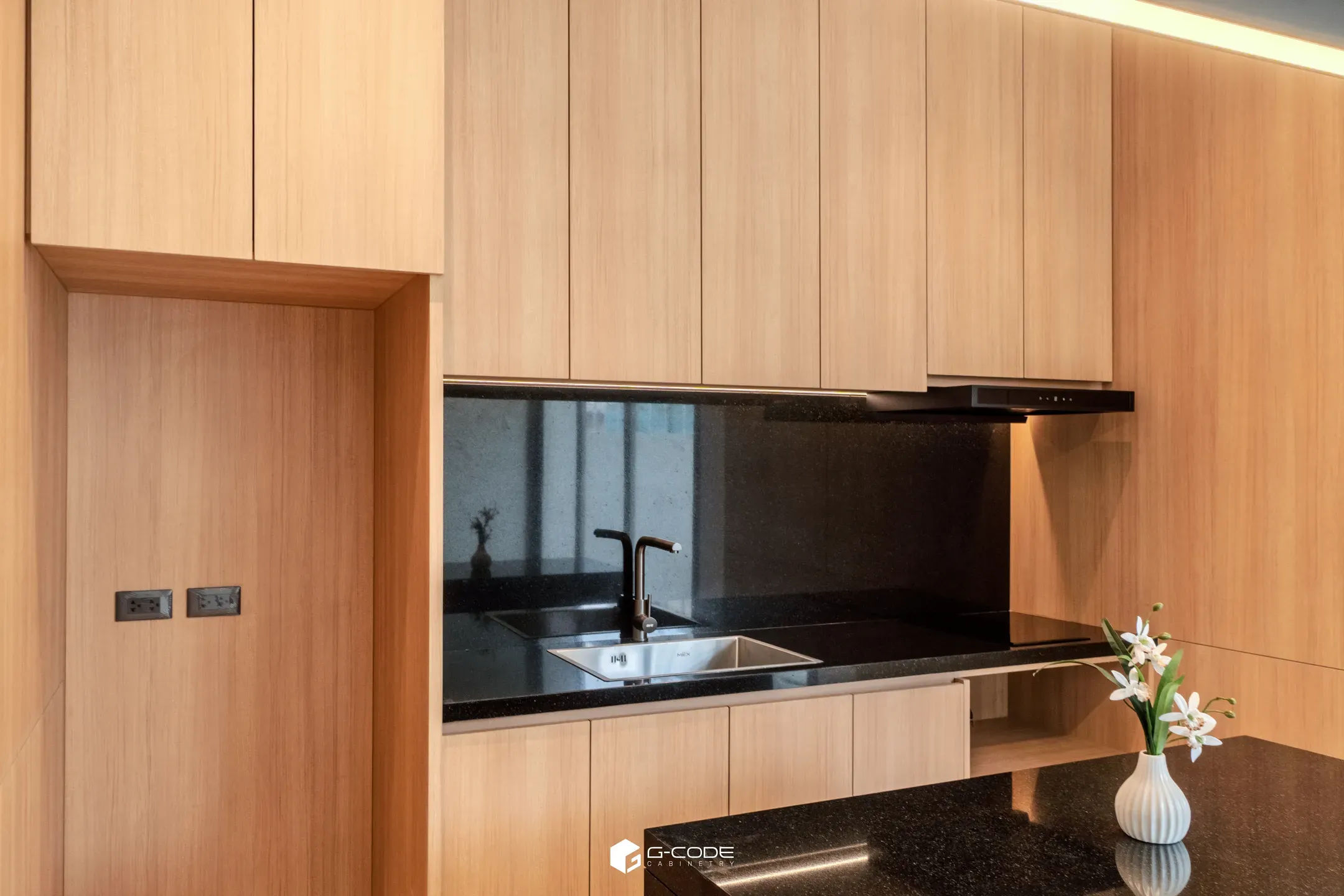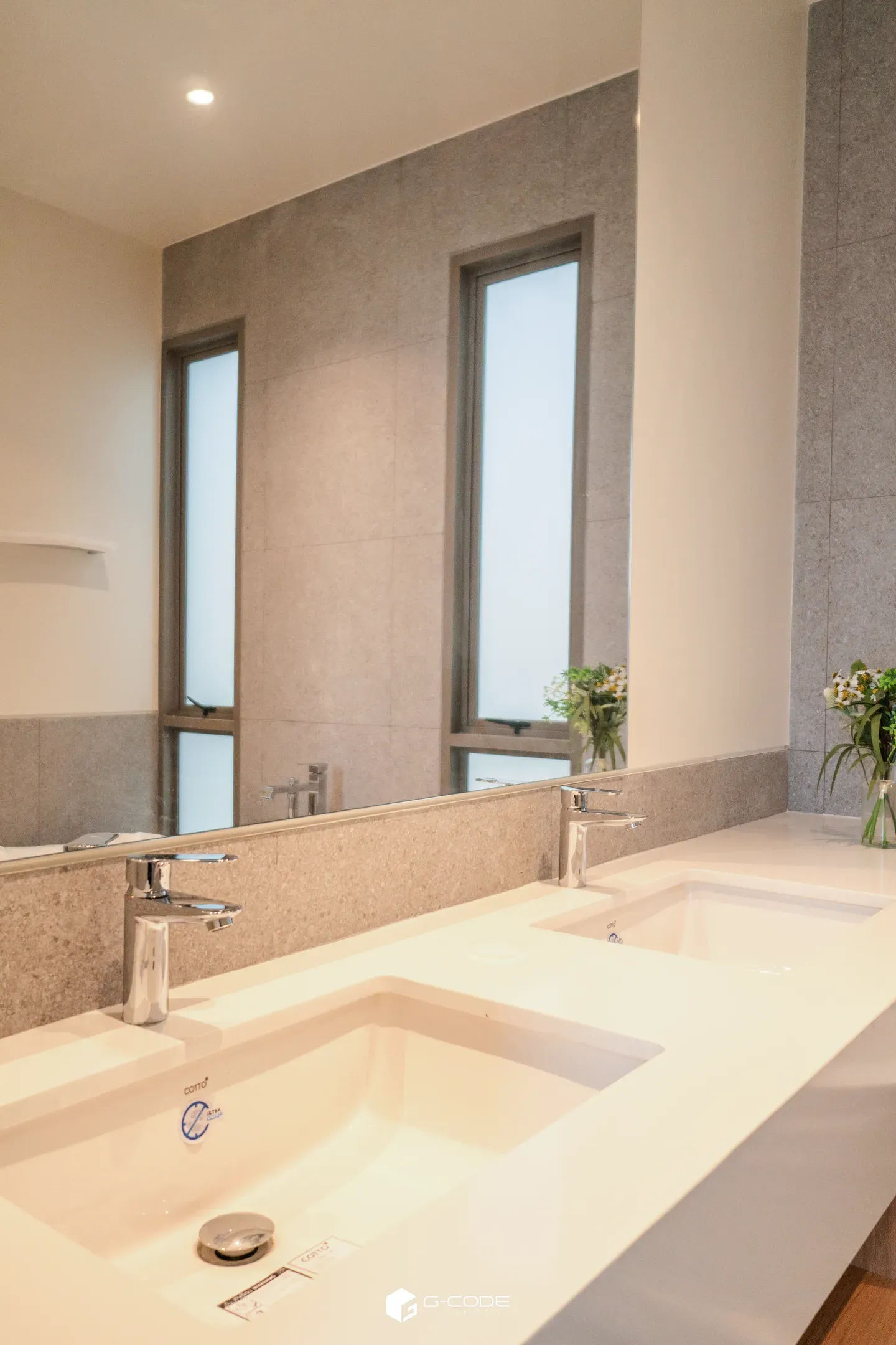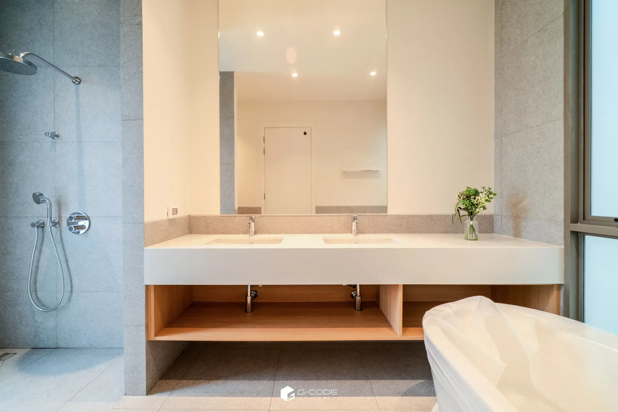 The design emphasizes a blend of wood and fabric laminates, bleached real oak wood, granite, mirrors, and hidden LED lighting in various details. Our challenge was controlling the material tones, keeping the joints sharp and smooth, and arranging the lighting system to achieve the dimension of light intended by the Designer.