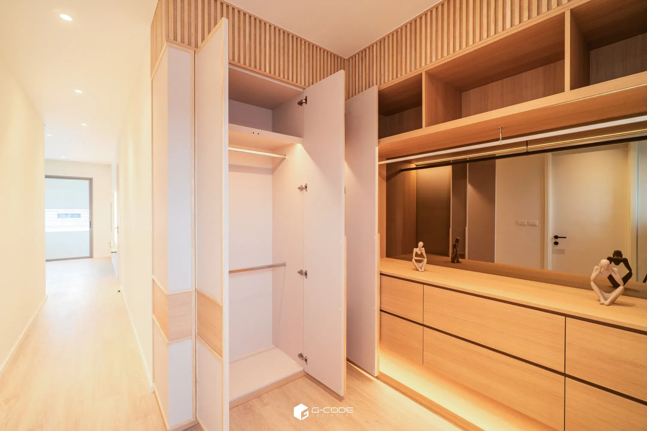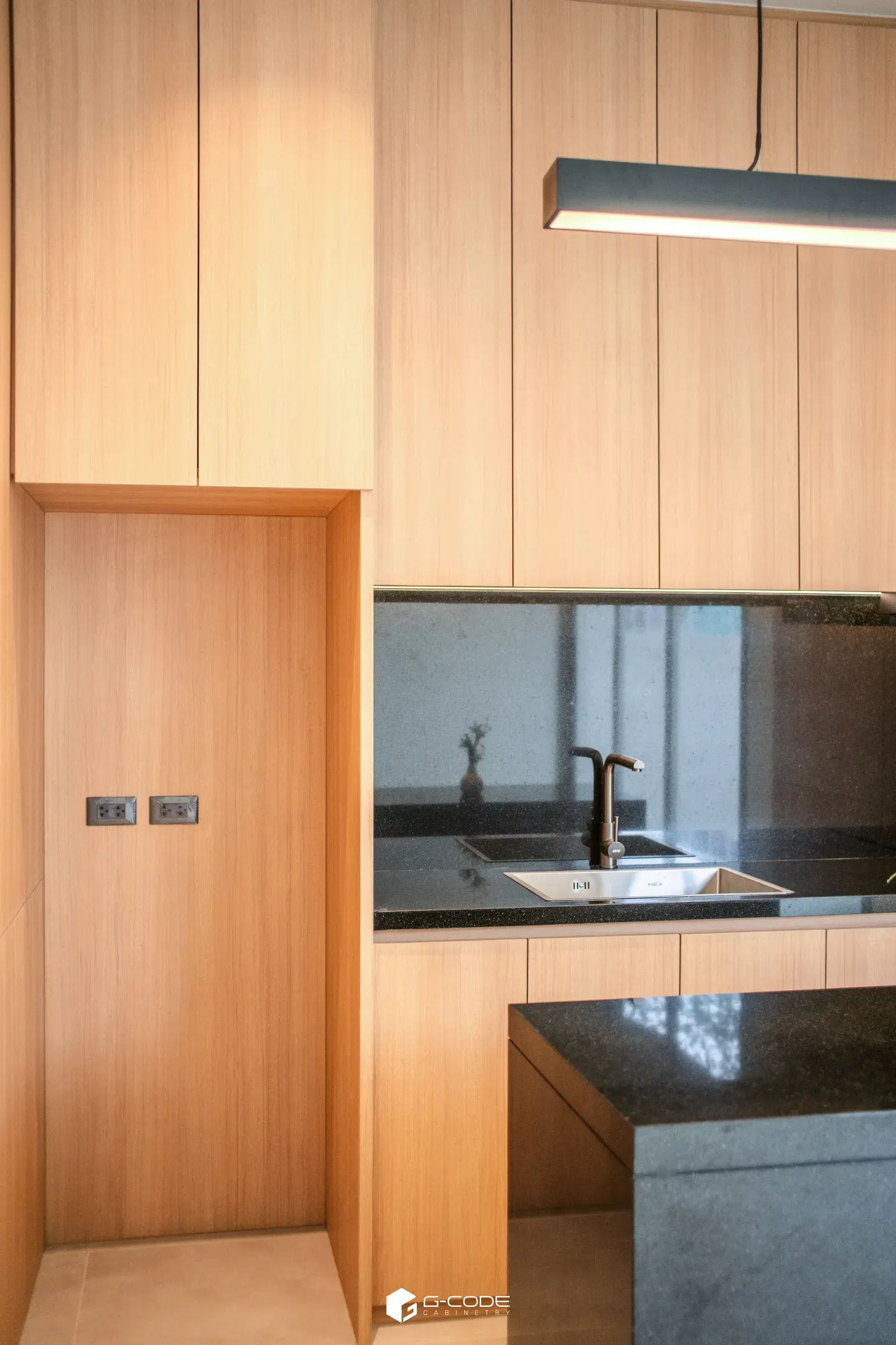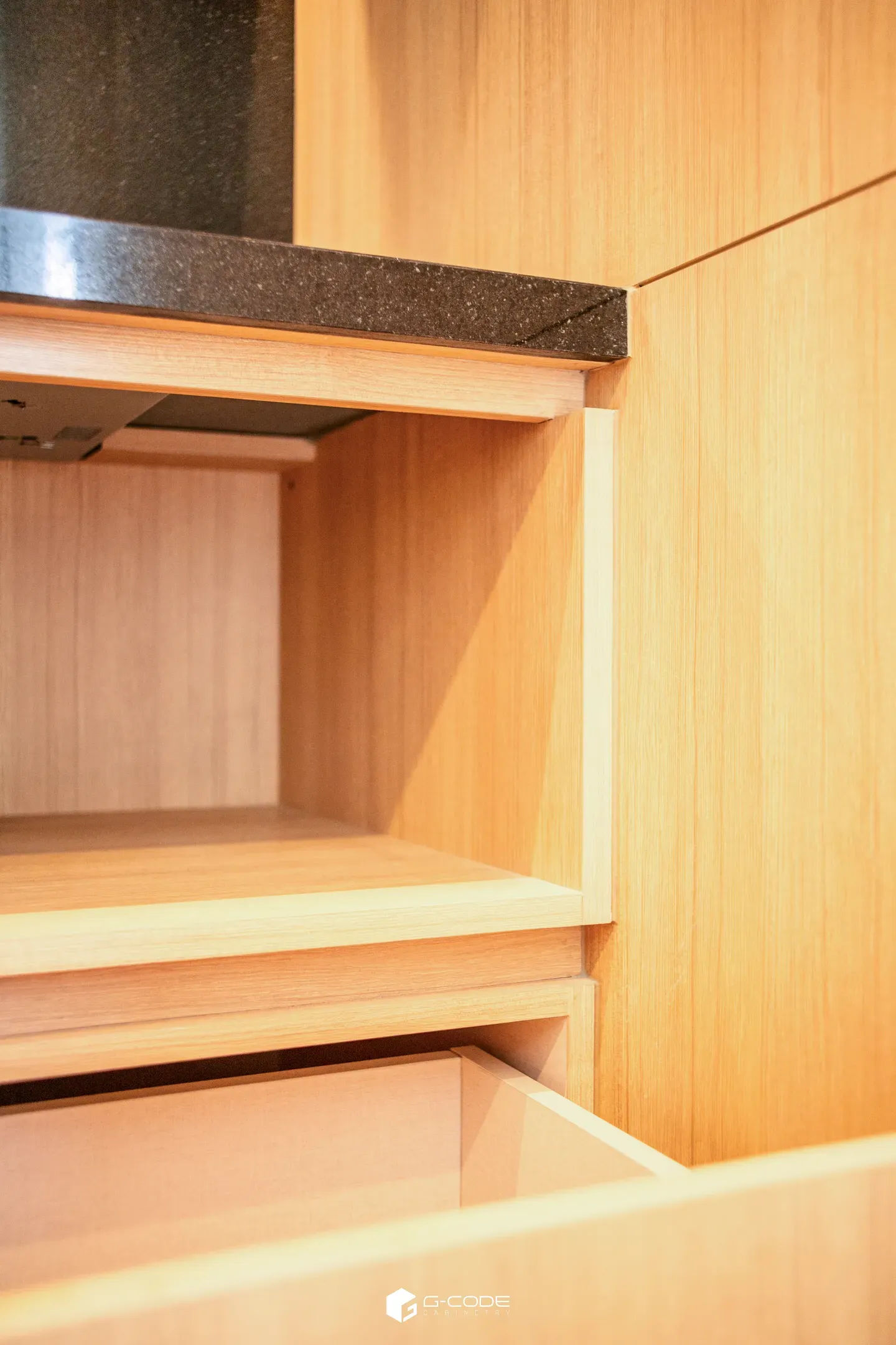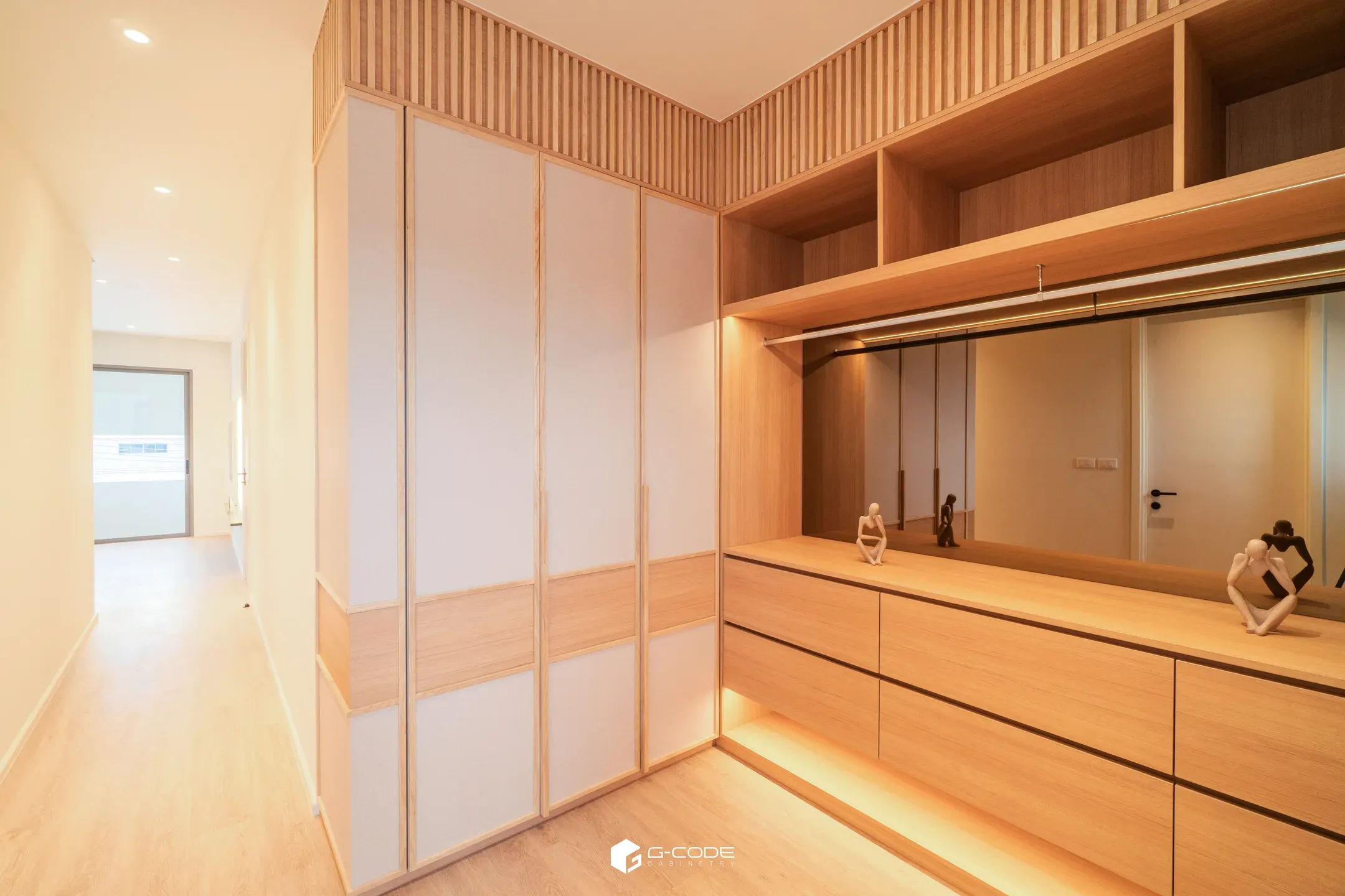 The design emphasizes a blend of wood and fabric laminates, bleached real oak wood, granite, mirrors, and hidden LED lighting in various details. Our challenge was controlling the material tones, keeping the joints sharp and smooth, and arranging the lighting system to achieve the dimension of light intended by the Designer.