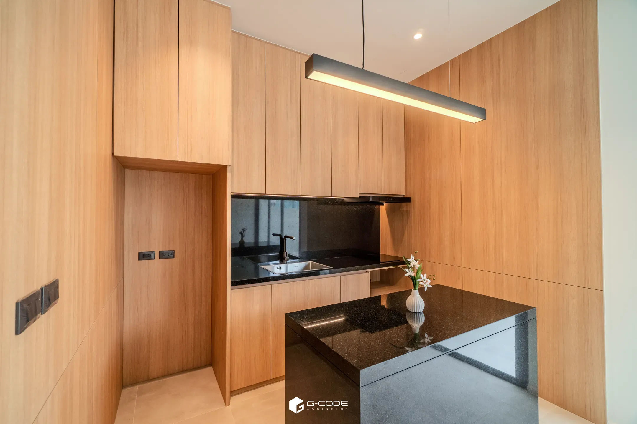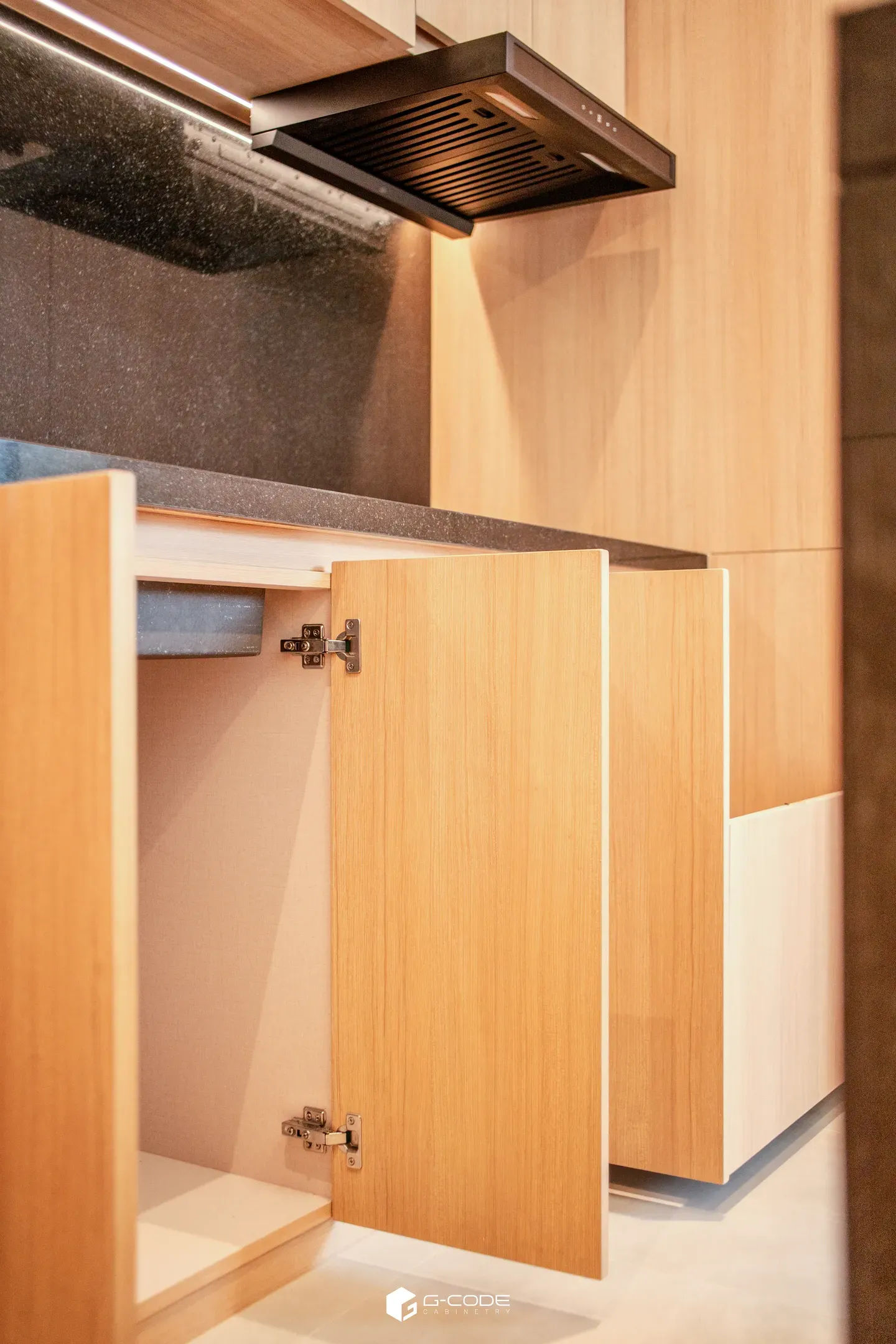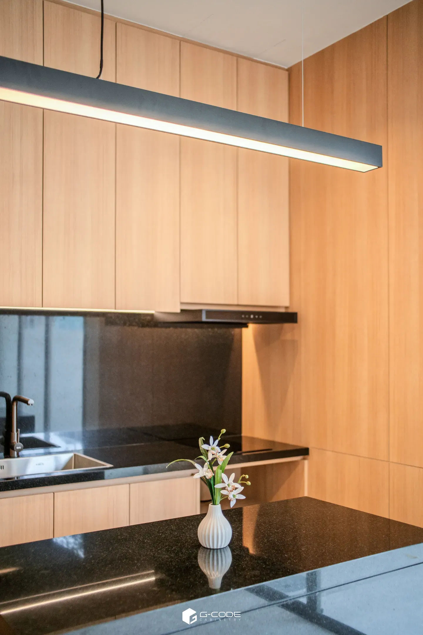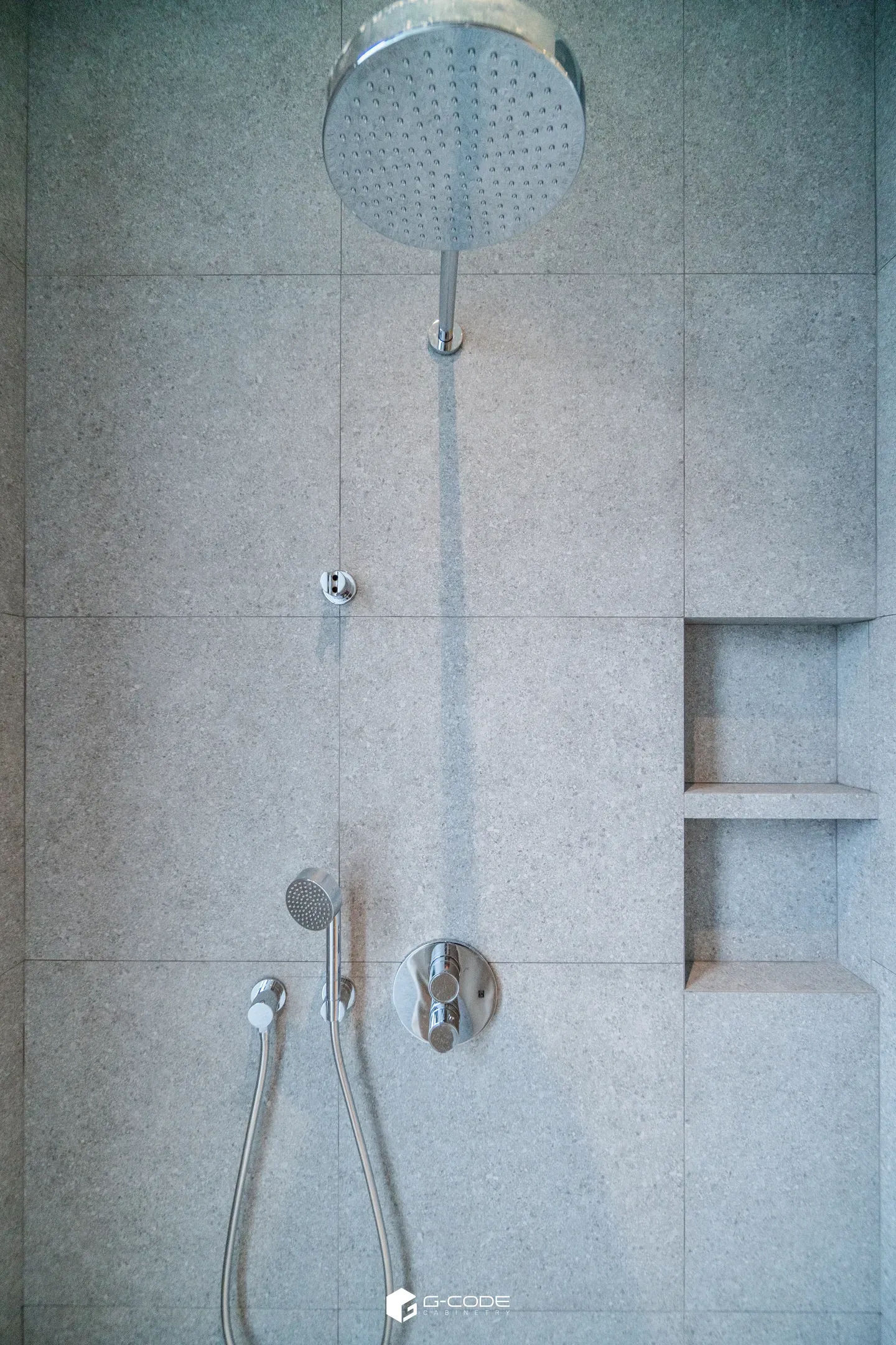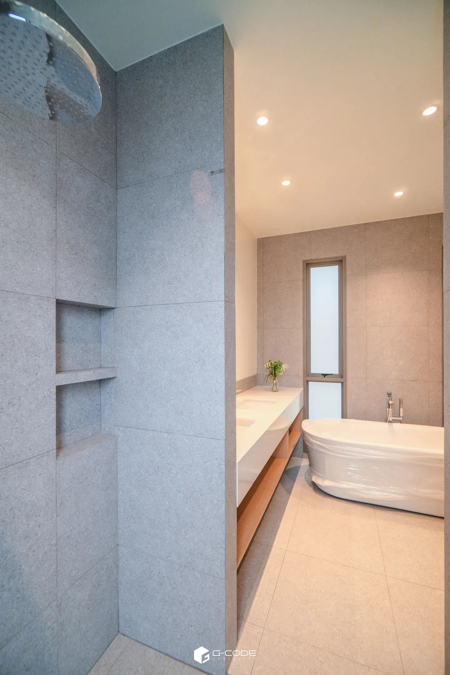 The design emphasizes a blend of wood and fabric laminates, bleached real oak wood, granite, mirrors, and hidden LED lighting in various details. Our challenge was controlling the material tones, keeping the joints sharp and smooth, and arranging the lighting system to achieve the dimension of light intended by the Designer.