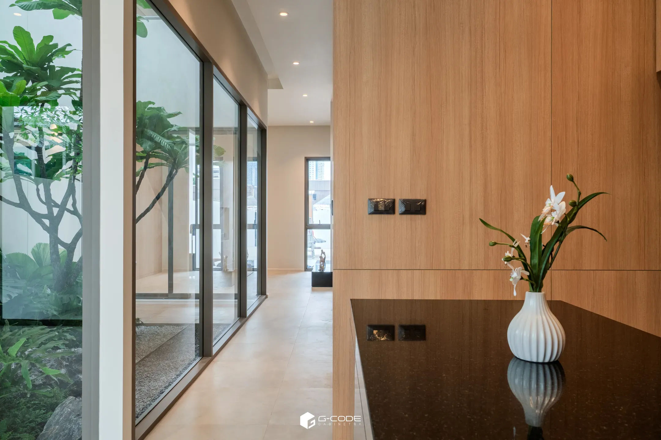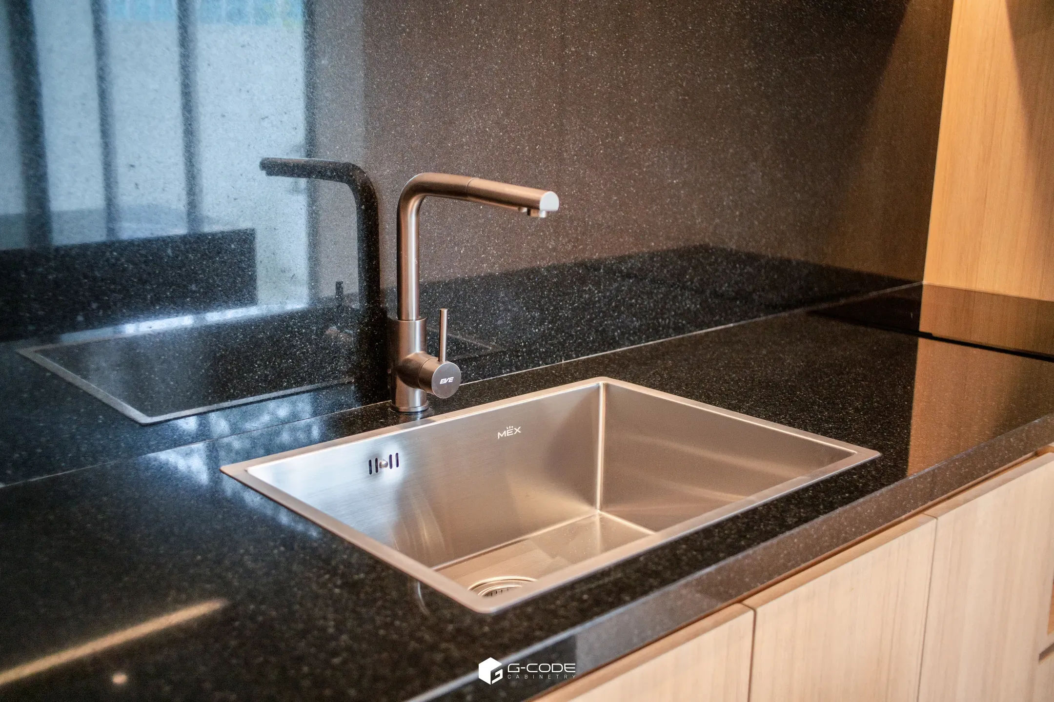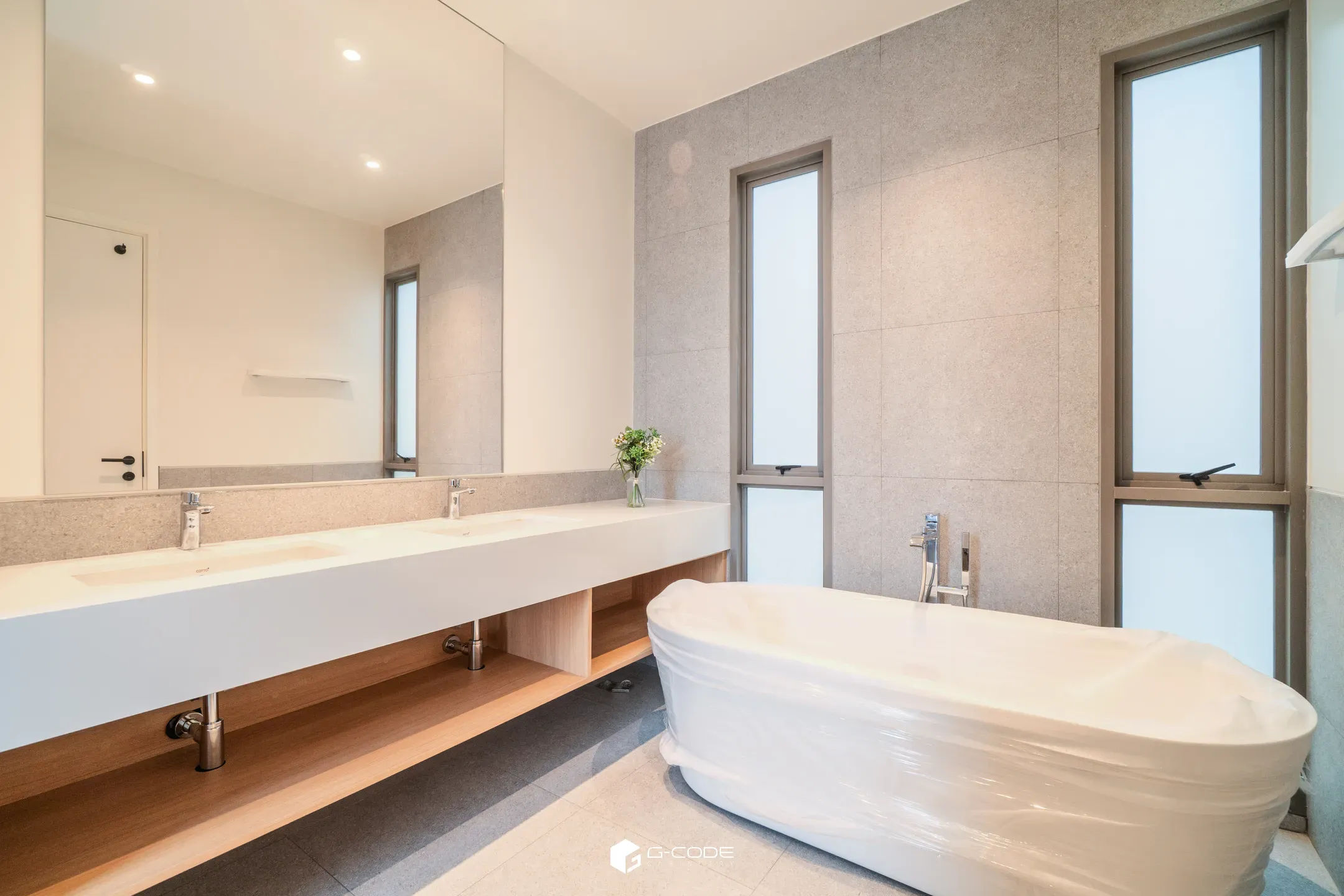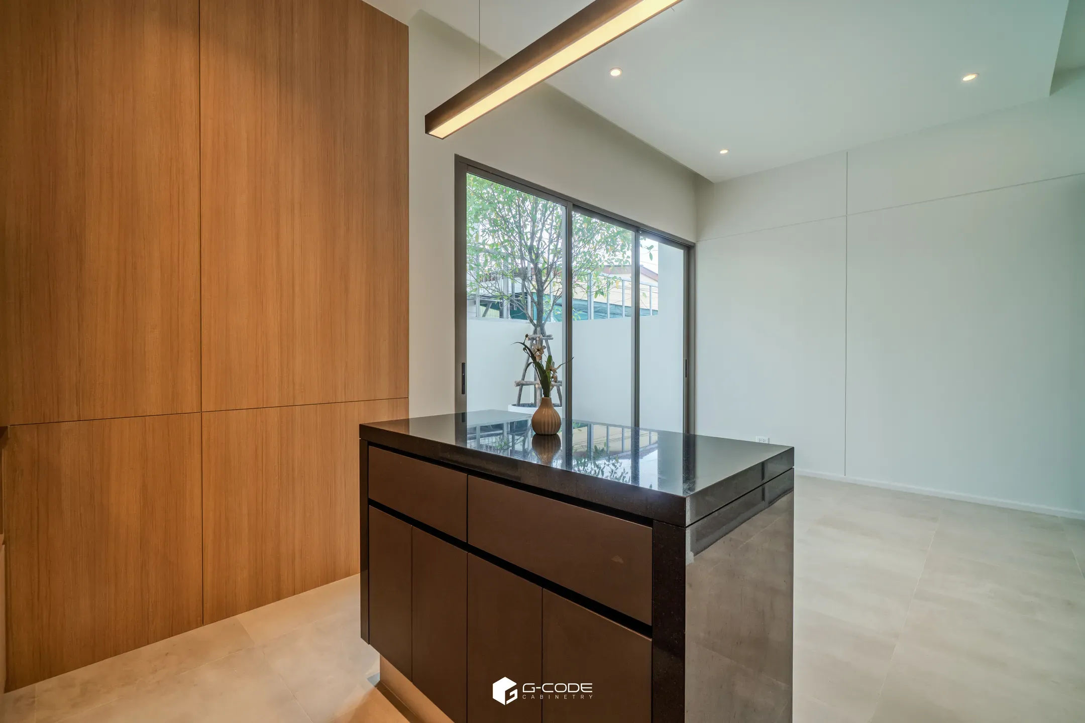 The design emphasizes a blend of wood and fabric laminates, bleached real oak wood, granite, mirrors, and hidden LED lighting in various details. Our challenge was controlling the material tones, keeping the joints sharp and smooth, and arranging the lighting system to achieve the dimension of light intended by the Designer.